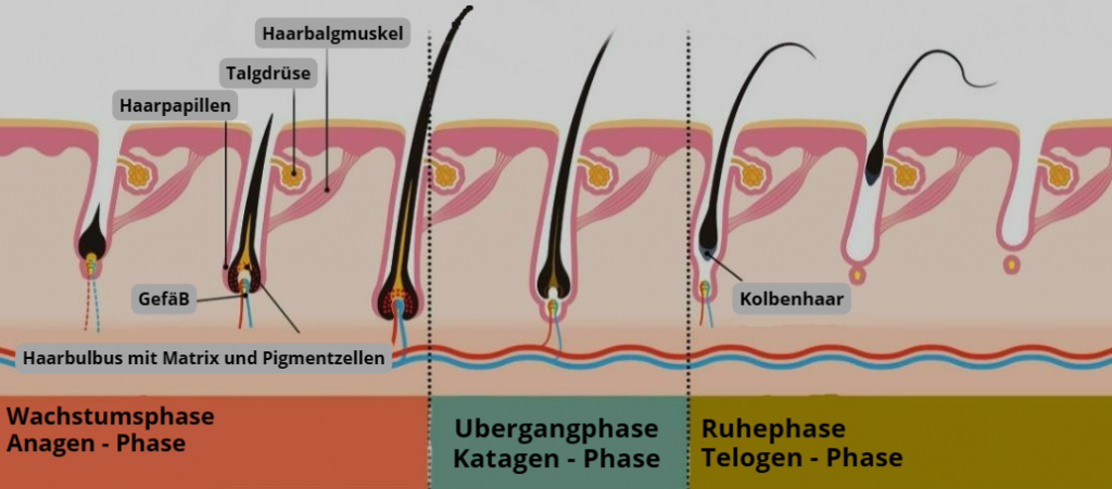 Haare befinden sich in unterschiedlichen Phasen. Die drei wichtigsten sind die Wachstumsphase, die Übergangsphase und die Ruhephase. In der Wachstumsphase ist das Haar mit der Wurzel verbunden und optisch sichtbar. In der Übergangsphase löst es sich von der Wurzel und geht langsam in die Ruhephase über, bis es ausfällt. Der Kreislauf beginnt daraufhin erneut.